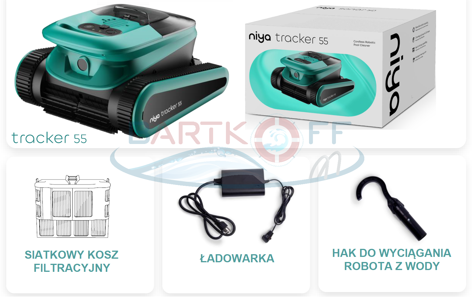 Niya Tracker 55 to zaawansowany, bezprzewodowy robot basenowy przeznaczony do czyszczenia basenów o długości do 12 m. Dzięki nowoczesnej technologii sonarowej oraz wydajnym silnikom bezszczotkowym, urządzenie zapewnia skuteczne i energooszczędne czyszczenie całej powierzchni basenu – od dna, przez ściany, aż po linię wody.