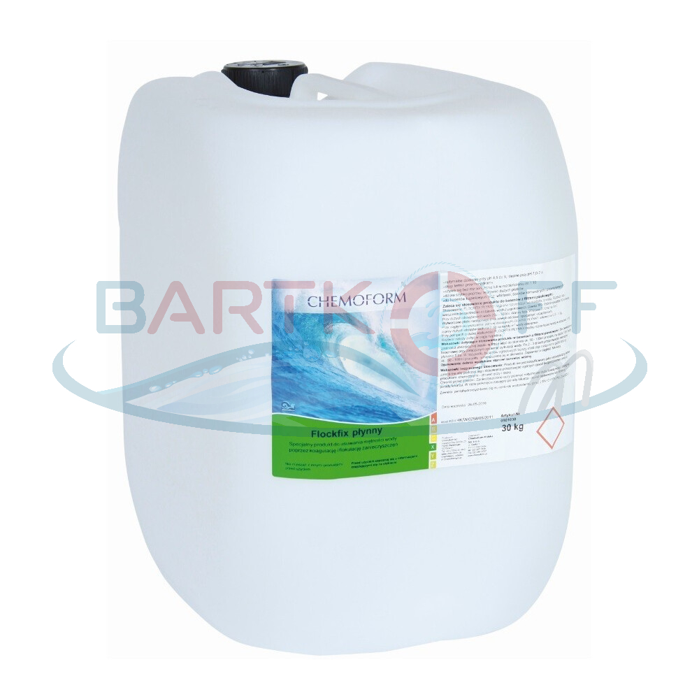 Flockfix 30 kg Chemoform to wysokiej jakości koagulant w płynie przeznaczony do skutecznego usuwania drobnych zanieczyszczeń z wody basenowej. Dzięki jego specjalistycznej formule, nawet najmniejsze cząsteczki brudu, które nie są wychwytywane przez filtr, zostają związane w większe skupiska i łatwo usunięte z systemu filtracyjnego.